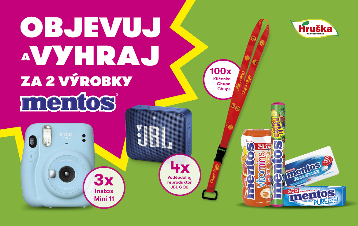 Kup jakékoliv 2 výrobky Mentos (libovolná kombinace) v kterékoliv prodejně Hruška v době trvání soutěže.